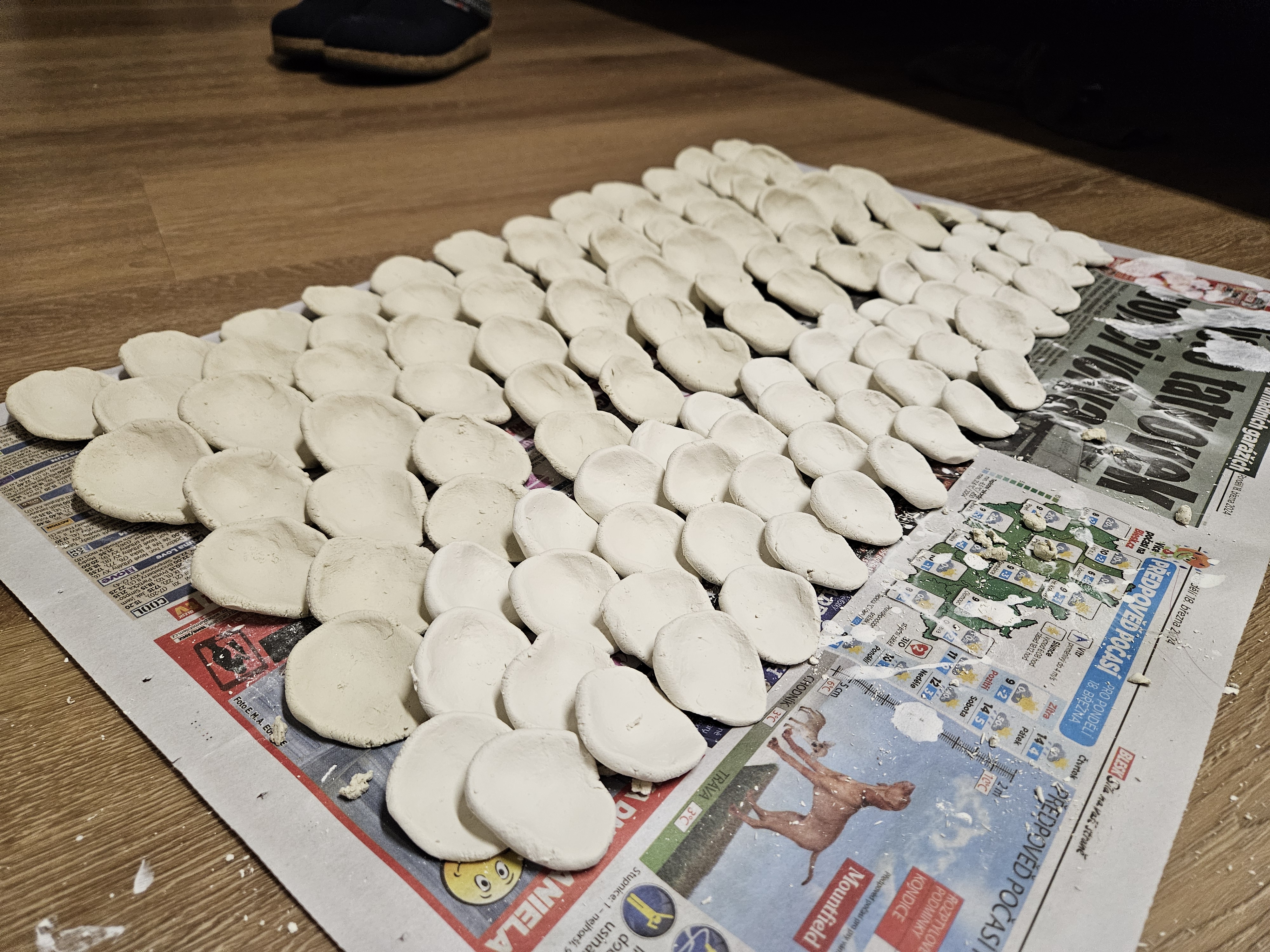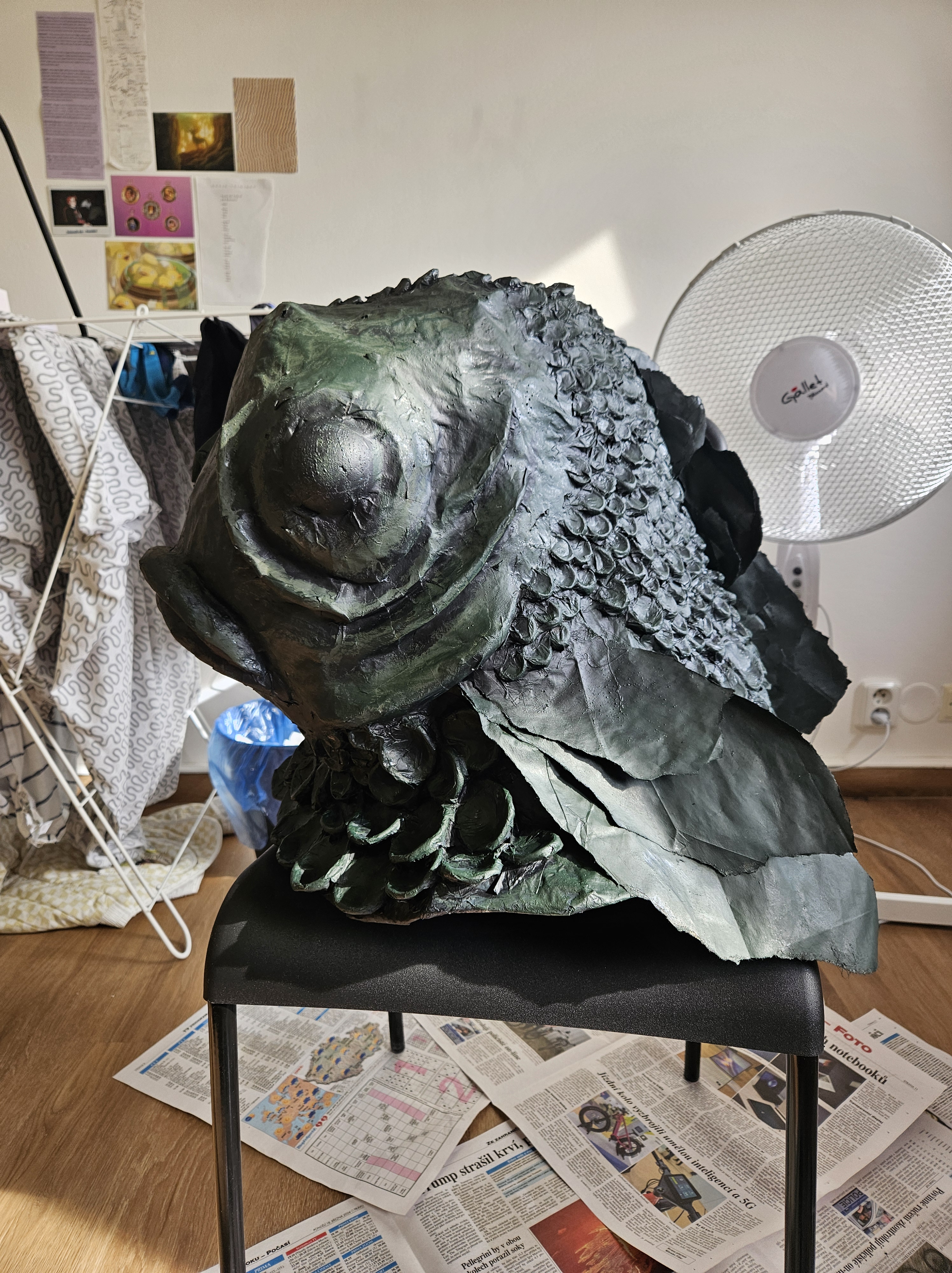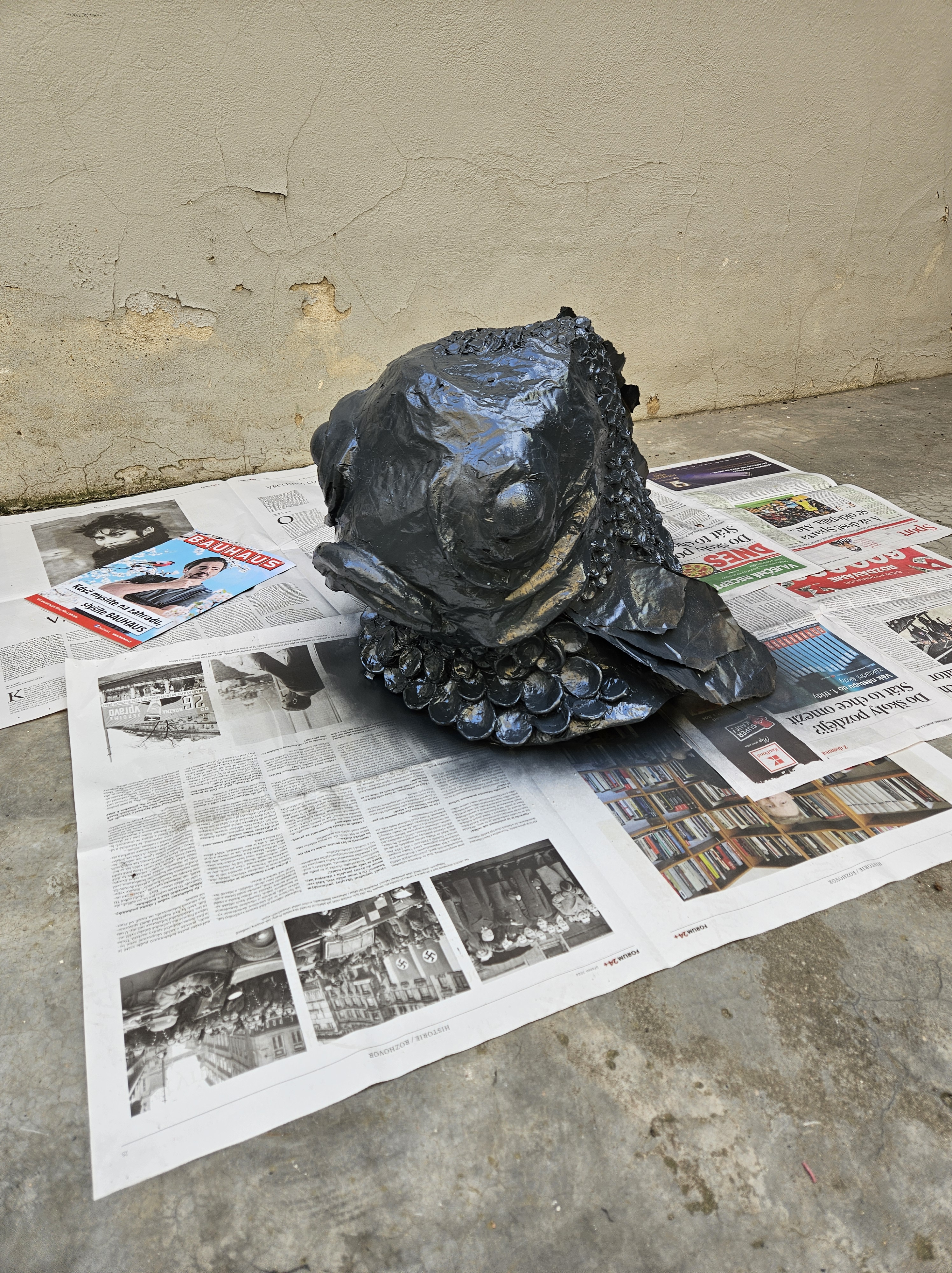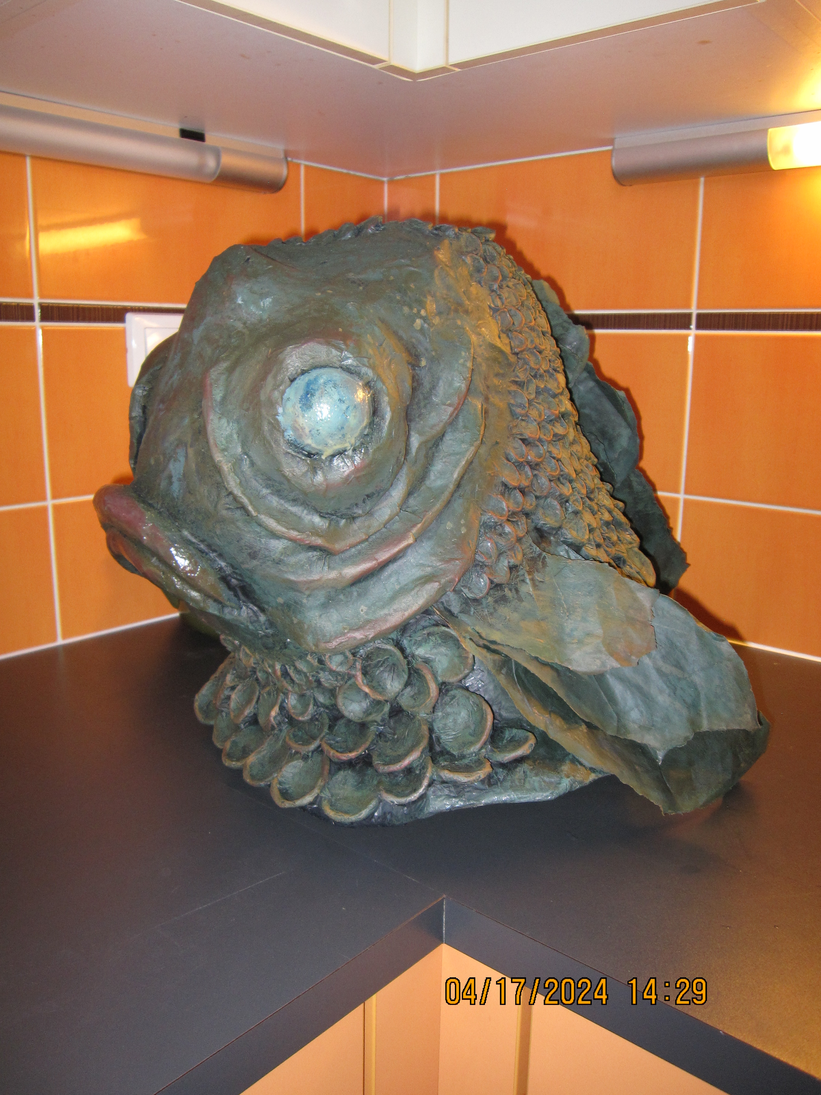 Wire mesh, papier-mâché, clay, spray paint, acrylic